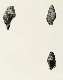 (Original description) The small shell has an elongate-ovate shape. It contains five or six whorls, which are regularly convex, with obscure appressed sutures and an acute apex.The surface of the shell is sculptured by coarse, nodose, revolving ribs, between which are finer and less nodose riblets. On each of the major ribs there are about twenty rounded nodes. The nodes of the different ribs are in line giving the shell the appearance of being longitudinally ribbed. The distribution of the revolving ribs and riblets is as follows: beginning at the suture on the body whorl there are two nodose indistinct ribs below which are two of the finer unnodose riblets, the anterior riblet being the heavier. Anterior to this are two nodose ribs with one fine indistinct unnodose riblet between. Between the last two nodose ribs just mentioned and the anterior end of the siphonal canal there are five of the major ribs between each of which excepting the last anterior two, there are two riblets, in each case the anterior of the riblets is heavier and shows a tendency to be nodose.