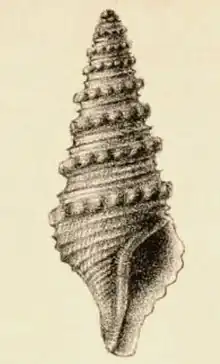The prominent row of tubercles around the middle of the whorls, the keel beneath the suture, and the broad sinus in the outer lip are the principal features of this species. The apex of the spire is broken. This makes it impossible to state with certainty the exact number of whorls, but they would probably amount to eleven or twelve. The entire surface exhibits fine flexuous lines of growth.[2]