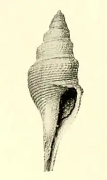 (Original description) The fusiform shell contains nine whorls. The first four are turbo-form and smooth. The others are sharply angulated by a shoulder a third of whorl below the suture. They are decorated by twelve to fourteen subequal spiral lines which are slightly nodose where the fine sinuous axial ribs cross them. A beaded sutural collar occurs just below the indistinct suture. The aperture is elongate with its greatest width above, narrowing below into a slender siphonal canal. The outer lip is thin. The inner lip is slightly calloused.[2]