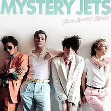 "Two Doors Down" is the second single from the Mystery Jets album Twenty One and it features a saxophone solo by Nik Carter[1] (of The Blackjack Horns). The single became their second highest-charting single in the UK Singles Chart, peaking at number 24, second to "The Boy Who Ran Away" which charted one place higher at number 23. In October 2011, NME placed it at number 100 on its list "150 Best Tracks of the Past 15 Years".[2]