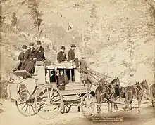 While prospectors flooded the area, along with them came those who would service the nascent mining industry. This included stagecoach lines that traveled between Sidney and the Black Hills carrying freight and passengers. Sometimes stagecoaches would depart Sidney for Deadwood three times each day. Conditions on the stagecoaches were usually cramped as upwards of sixteen people could be carried at a time. Between 1874 and 1880 most of the supplies and freight coming to and from the gold camps traveled this trail. Thousands of stagecoaches and wagons are estimated to have traveled the route during this time. At the peak of the gold rush in 1878 and 1879, fifty to seventy-five freight wagons left Sidney every day and an estimated 22-million pounds of freight traveled along the trail.[9]
