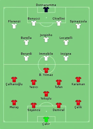 - 1 2 3 "Tactical Line-ups – Turkey v Italy" (PDF). UEFA.com. Union of European Football Associations. 11 June 2021. Retrieved 11 June 2021.