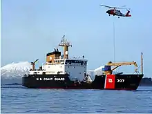 Maple also supported search and rescue missions. In May 2004 the ferry LeConte went aground on Cozian Reef on her way to Sitka. Maple and USCGC Anacapa responded to the scene.[17] In September 2004 Maple was dispatched as part of a large, unsuccessful effort to find an aircraft that was lost with five people aboard. A light oil sheen was found on Peril Strait and it was hoped that Maple's side-scan sonar might locate the wreck on the sea bottom.[18] Aircraft spotted a drifting barge 60 miles southeast of the Kenai Peninsula in September 2006. Maple intercepted the craft, which was 200 feet (61 m) long, and found that it was abandoned and empty, with no identifying marks as to its origin.[19]