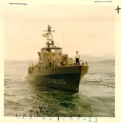 At the request of the United States Navy, in October 1965, she was alerted for service in South Vietnam and assigned to Coast Guard Squadron One in support of Operation Market Time along with 8 other Point class cutters.[12][13] While the crew completed overseas training and weapons qualifications at Coast Guard Island and Camp Parks, California, Point Kennedy was loaded onto a merchant ship, and transported to Subic Bay, Philippines arriving in January 1966 where she was refitted for combat service.[5] Shipyard modifications included installation of new single-sideband radio equipment, additional floodlights, small arms lockers, bunks, additional sound-powered phone circuits, and the addition of 4 M2 machine guns. The original Oerlikon 20 mm cannon was replaced with a combination over-under .50 caliber machine gun/81mm trigger-fired mortar that had been developed by the Coast Guard for service in Vietnam.[4][5][14][15] For service in Vietnam, two officers were added to the crew complement to add seniority to the crew in the mission of interdicting vessels at sea.[16]