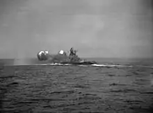 At Ulithi, Alabama re-joined the fast carrier task force, which had by this point reverted to Fifth Fleet. The fast carrier task force got underway on 9 May to support the forces fighting in the Battle of Okinawa, who had gone ashore on 1 April. The Japanese had massed significant reserves of aircraft for kamikaze strikes against the invasion fleet. During one such attack on 14 May, while approximately 120 miles southeast of the Japanese home island of Kyushu, Alabama shot down two Japanese aircraft and helped to destroy two others, but one kamikaze nevertheless penetrated the fleet's anti-aircraft defenses and struck Enterprise.[23] The operations off Okinawa continued for the next two weeks and on 4–5 June, the fleet was hit by another typhoon and Alabama—part of TG 38.1 at this time—again suffered only superficial damage, though many other vessels in the group were badly damaged. The fleet resumed its normal operations in support of the Okinawa fight on 7 June, including air strikes on Japanese airfields on Kyushu the next day that Alabama supported. With an escort of five destroyers on 9 June, Alabama, Indiana, and Massachusetts steamed to shell Japanese facilities on the island of Minami Daito Jima; they repeated the attack the next day. The fleet thereafter returned to Leyte Gulf to begin preparations for a series of attacks on the Japanese Home Islands.[7][24]