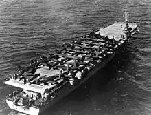 Upon being commissioned, Cape Esperance underwent a shakedown cruise down the West Coast to San Diego. She then underwent two transport missions, ferrying new aircraft to bases in the South and West Pacific, and returning to the West Coast with damaged aircraft. After returning from her second transport run, she was assigned to Task Group 30.8, the replenishment escort carrier group.[10] She was loaded with replacement aircraft at San Francisco, and departed on 5 October 1944. She rendezvoused with the other replenishment carriers on 2 November, and provided replacement aircraft to the Fast Carrier Task Force operating against Japanese positions on Leyte and Luzon. The replenishment carriers would meet with the frontline carriers at designated rendezvous days, during which supplies and aircraft would be transferred. She was based from and received additional replacement aircraft at Ulithi and Guam.[9]
