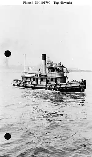 Hiawatha was built as a civilian, wooden-hulled steam tug of the same name in 1903 by Brown at Tottenville, Staten Island, New York. The U.S. Navy acquired her under charter from her owner for World War I service on 1 August 1918. She was commissioned as USS Hiawatha (ID-2892[1] or SP-2892[2]) at New York City the same day.