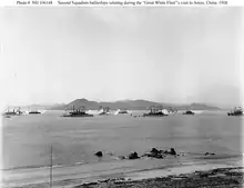 The ship then steamed back down to San Francisco in early July. There, she joined the Great White Fleet, which had departed Hampton Roads, Virginia, the previous year on the first leg of its global cruise.[3] The cruise of the Great White Fleet was conceived as a way to demonstrate American military power, particularly to Japan. Tensions had begun to rise between the United States and Japan after the latter's victory in the Russo-Japanese War in 1905, particularly over racist opposition to Japanese immigration to the United States. The press in both countries began to call for war, and Roosevelt hoped to use the demonstration of naval might to deter Japanese aggression.[4]