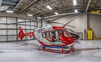 The first operational flight was in April 1985 and carried a heart attack patient from Coloma, Wisconsin who survived. The initial staff was three doctors, six nurses, three pilots and one mechanic. There was no aircraft hangar and maintenance on the aircraft was performed outside with a helipad in the parking lot. There was also some controversy in nearby Shorewood Hills, Wisconsin over noise from the helicopter. 20 years later, it was staffed by a rotating crew of 23 doctors, 12 nurses, eight communications specialists and six pilots and had three helicopters and a ground ambulance.[2] In 2005, an $8 million project created a heliport on the 8th floor rooftop of the hospital replacing the parking lot landing pad and created larger hangars to support three aircraft.[3] The ambulance was added in 2004 for inter-hospital transports to reduce costs and free a helicopter for emergency transports.[4]