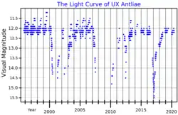 UX Antliae is a post-AGB and R Coronae Borealis variable star that has a base apparent magnitude of around 11.85, with irregular dimmings down to below magnitude 18.0.[8]