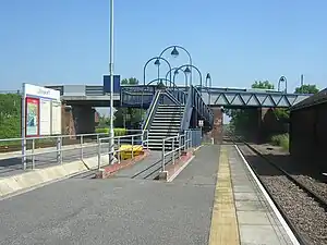 The station opened on 29 May 1839 on the York and North Midland Railway near where it crossed the River Wharfe.[1] It appears to have been redesigned and slightly relocated following the construction of the bridge carrying New Road (the B1223) over the tracks: the first station building was either adjacent and at right angles to the Ulleskelf Arms public house, or directly across the track from the pub on West End Road.[2] Neither of these buildings survives. A 1888 survey shows the station in its current position on the south side of the new road bridge,[3] with a new access road from the east end of the bridge across Hall Garth to the junction of Main Street and a newly-extended Church Fenton Lane, alongside a goods yard built on the site which was a plant nursery on the 1849 map. Further evidence of this change in layout is the terrace called Station Cottages on Main Street at the junction of Church Fenton Lane, now some 200m north of, and out of sight of, the modern station. The station avoided the Beeching Axe in the mid 1960s due to the poor road network in the area (there being no easily accessible road bridge over the river for York-bound commuters).[4] Today the station is unstaffed with all trains operated by Northern. Though there are four tracks, the island platform only serves the eastern pair.