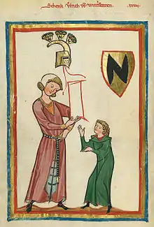 Ulrich inherited the title of Schenk (cupbearer).[4][3] On account his family connections, he was a prominent and influential individual in Swabia.[5] He appears in documents between 1241 and 1280.[4][6] The first document to mention him is one in which his grandfather arranges a sale of property to Weissenau Abbey.[3] His career as a poet is usually dated earlier, before he became a canon (priest) of Augsburg Cathedral.[4] He died after 1280.[5]