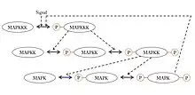 A ubiquitous signaling motif that exhibits ultrasensitivity is the MAPK (mitogen-activated protein kinase) cascade, which can take a graded input signal and produce a switch-like output, such as gene transcription or cell cycle progression. In this common motif, MAPK is activated by an earlier kinase in the cascade, called MAPK kinase, or MAPKK. Similarly, MAPKK is activated by MAPKK kinase, or MAPKKK. These kinases are sequentially phosphorylated when MAPKKK is activated, usually via a signal received by a membrane-bound receptor protein. MAPKKK activates MAPKK, and MAPKK activates MAPK.[35] Ultrasensitivity arises in this system due to several features: