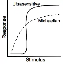 In molecular biology, ultrasensitivity describes an output response that is more sensitive to stimulus change than the hyperbolic Michaelis-Menten response. Ultrasensitivity is one of the biochemical switches in the cell cycle and has been implicated in a number of important cellular events, including exiting G2 cell cycle arrests in Xenopus laevis oocytes, a stage to which the cell or organism would not want to return.[1]