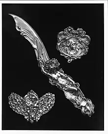 The company was established by five sons from a German immigrant family. The oldest founded a jewelry business between 1870-1872 and began the manufacture of sterling silver items in 1878. Other sons gradually joined the firm, among them a silversmith and an engraver whose brother-in-law became the leading artistic designer. The firm's best years were from 1895 to 1907; by 1901 it had just under 300 employees. The 1903, 1904 and 1906 catalogs show over 150 hatpin designs, more than half Art Nouveau. All told, their 1904 catalog included some 3,200 distinct items; they employed stamping machines to turn out many of their products. While most items were jewelry, the best-selling items were dresser sets. They also produced tableware such as trays and sauceboats.