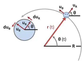 The time derivative of is found the same way as for . Again, is a unit vector and its tip traces a unit circle with an angle that is π/2 + θ. Hence, an increase in angle dθ by implies traces an arc of magnitude dθ, and as is orthogonal to , we have: