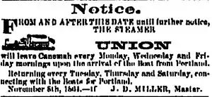 ![]() Advertisement for steamer Union ex Unio, February 22, 1865 | |