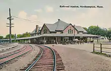 The Connecticut River Railroad opened to passenger service between Springfield and Northampton in late 1845; trains reached Deerfield in August 1846, Greenfield in December 1847, and the junction with the Central Vermont Railway in January 1849. When the Vermont and Massachusetts Railroad reached Brattleboro in 1850, the Connecticut River Railroad began running through service from Springfield to Brattleboro.[6] Over the next century, the line was host to a mix of local and long-distance passenger and freight service. It became part of the route for numerous New York-Montreal trains as early as the 1860s, and was acquired by the Boston and Maine Railroad in 1893.[6] Northampton's Union Station was built in 1896-97 during a project to eliminate grade crossings through downtown Northampton. The station unified two separate stations, serving the Connecticut River mainline, the Central Massachusetts Railroad, the New Haven and Northampton Railroad, and the NH&N's Williamstown Branch.[7] The station opened on Sunday morning December 5, 1897, in time for the departure of the 9:25 a.m. train for Springfield. It was reported that upwards of 2,000 people visited the station on its opening day.[8]