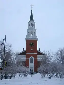 Built in 1816,[3] the Unitarian Universalist Meeting House (formerly known as The Brick Meeting House) is the oldest remaining place of worship established by settlers in Burlington, Vermont.[4] It is located along the northern side of the intersection of Pearl Street and the Church Street Marketplace.
