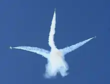 The three memorial spires range from 201 feet (61 m) to 270 feet (82 m) high and appear to be soaring; its array of stainless steel arcs against the sky evokes the image of "contrails of the Air Force Thunderbirds as they peel back in a precision 'bomb burst' maneuver." Only three of the four contrails are depicted, at 120 degrees from each other, as the absent fourth suggests the missing man formation traditionally used at Air Force funeral flyovers.[5]