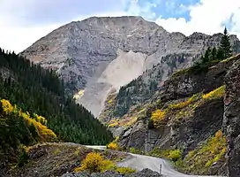 United States Mountain is a 13,036-foot-elevation (3,973-meter) mountain summit located in Ouray County of southwest Colorado, United States.[3] It is situated six miles southwest of the community of Ouray, on land managed by Uncompahgre National Forest. It is part of the Sneffels Range which is a subset of the San Juan Mountains, which in turn is part of the Rocky Mountains. It is set west of the Continental Divide, 2.3 miles south of Potosi Peak, and 2.5 miles southeast of Stony Mountain. Recreation enthusiasts heading for Yankee Boy Basin traverse below the northern base of the mountain. Topographic relief is significant as the north aspect rises 3,300 feet (1,000 meters) above the Camp Bird Mine in approximately one mile. Mining activity in the immediate area produced significant amounts of gold and silver.[4] The Hidden Treasure Mine is a gold mine located on the south slope at 11,759-feet elevation.[5]
