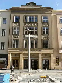 DOPZ was an acronym of the cooperative society "Družstvo obchodních a průmyslových zaměstnanců" (full name "Stavební a obchodní družstvo zaměstnanců obchodu a průmyslu, zapsaná společnost s ručením omezeným") that had owned the whole building since September 1927.[4] Though the cinema was originally called Bio Dopz, it was not run by the cooperative, but by a foundation designed to support university students in Moravia and Silesia named after T. G. Masaryk ("Masarykův fond na podporu studentstva vysokých škol na Moravě a ve Slezsku").[5] The foundation asked for a licence to operate a cinematograph as early as on 11 July 1922, and on 28 December 1923 it was granted a licence to operate the Bristol cinema in Křenová street valid until the end of 1926. However, the foundation found it difficult to acquire the premises needed to run a cinema and so it kept looking at other places – such as the cinema Universum in Lidická (then called Nová) street or a hall in the new Nový domov building in Gorkého (Folkensteinerova) street – until the licence expired. The foundation was promised a new licence in April 1927 and in June 1928, it was offered by DOPZ to run a cinema in its building (DOPZ Palace) located between two squares – Moravské náměstí and Jakubské náměstí (Jacobian Square). Accordingly, it asked for a new licence on 24 September 1928. After some disputes with the local authorities, the foundation was granted a preliminary licence on 27 December 1929 and a full licence on 6 March 1930. While it was trying to obtain a licence, the premises of the cinema were acquired by the company Kraus a spol. On 20 December 1929, the foundation entered into an agreement with the company valid until the end of 1935. According to the agreement, the company set up and run the cinema using the licence acquired by the foundation; in return, it paid 8% of its gross revenue to the foundation. In its turn, the foundation was paying 40% of its net gains to three different associations.[6]