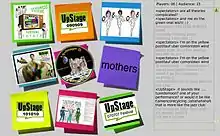"Players" log into UpStage and have access to the "Studio" where they can upload media, create "stages", and assign media to stages. Once on the stage, a logged-in player has access to numerous tools which allow them to manipulate the media – place, move and speak aloud with graphical avatars (using text2speech), change backdrops, play audio files, draw directly on the stage in real time, add live web cam feeds, use text chat and perform other tasks in order to create and present a performance.[7]