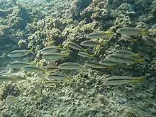 Upeneus moluccensis is sold fresh in markets as well as being utilized for fish meal and valued for its roe.[2] It is regarded as a "trash fish" by fishermen in the South China Sea because of its relatively small size.[1] The annual catch of goatfish at the fishing harbour of Visakhapatnam in India ranges between 2177 and 3463 tonnes, averaging 2859 tonnes, of which U. moluccensis makes up 18%.[5] In the Mediterranean U. moluccensis is now an important commercial species for trawl fisheries.[3]
