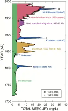 The same ice cores were also tested for mercury deposition from natural and human-induced activities. This is the first known instance in which ice cores have been used to determine mercury deposition from a mid-latitude glacier in North America, as all previous studies have been derived from other sources.[5] The majority of mercury deposition is by way of the atmosphere and sources of the element may be from volcanic activity or from industrialization, but volcanoes are believed to contribute a small proportion of the mercury.[5] The ice core samples from the Upper Fremont Glacier indicated that levels of mercury increased dramatically during the industrial revolution and have decreased significantly since the mid-1980s. It is believed that the decrease in mercury deposition since the 1980s coincides with the passage of the Clean Air Act.[5]