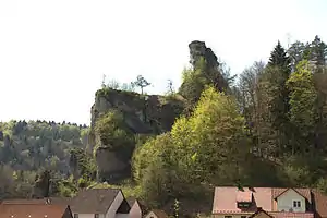 The ruins of Upper Tüchersfeld Castle (German: Burgstall Oberntüchersfeld) are all that remains of a high medieval castle that once rose high above the valley of the Püttlach in the church village of Tüchersfeld in Germany's Franconian Switzerland. It was built on a spur of the Mittelberg and was one of two castles in the village, the other being the Lower Tüchersfeld Castle.