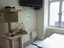 Upstairs cafés (Chinese: 樓上cafe) are cafés in Hong Kong that are located above street level. They became popular in the early 2000s.[1] and are mainly located in the upper floors of old commercial and mixed residential/commercial buildings in districts such as Mong Kok, Tsim Sha Tsui and Causeway Bay.[2] They have been categorized as a specific kind of catering outlet in Hong Kong, with a special classification of "upstairs cafés" in Hong Kong’s dining guide websites such as OpenRice.[3] Most of them have themed decorations such as pets, teddy bears, manga, or classrooms.[1][4] Apart from food and drinks, many upstairs cafés in Hong Kong also provide free entertainment for customers such as Jenga, card games, chess sets and board games.[5] Customers of upstairs cafés sometimes reserve the entire outlet for parties and gatherings due to the lower price point compared to restaurants at street level.[6][7] Upstairs cafés are typically small businesses and are usually tiny, unadvertised, and located in unmarked buildings in Hong Kong.[2] They are far from the dining outlets on the streets which have high visibility.[1] Therefore, it is difficult for people to know the existence of these upstairs cafés.[8] People in Hong Kong usually learn about upstairs cafés from their friends, magazine articles, catering guide websites, or online blogs and forums.[2]
