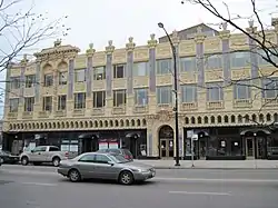 The Uptown Broadway Building is a historic three-story building at 4703–4715 North Broadway in Uptown, Chicago.[2] Built in 1926, it was designed by Walter W. Ahlschlager and is known for its ornate terra-cotta facade, depicting ancient gods, rams' heads, shields, helmets, birds, fruits, and trophies.[3] Lynn Becker of the Chicago Reader has called the exterior "a riotous, Spanish-baroque-inspired hallucination".[4] According to unconfirmed local legends, Al Capone operated a speakeasy in the building's basement.[3]