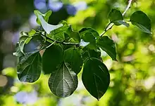 Attaching by adventitious roots, its stems are up to 10 cm in diameter, are occasionally armed with stinging hairs and exude copious and clear potable sap when cut. Bark is grey to brownish-black and longitudinally striate with large leaf scars on young branches. Pith is spongy, or stems are hollow in centre. Leaves are simple and with drip tips, elliptic to ovate with entire margins, and spirally arranged. Leaves are strongly 3-veined at the base, have 2–4 pairs of lateral nerves, the basal pair extending into upper third of the leaf. Flowers are small, greenish-white in colour and in lax axillary cymes. Inflorescences on male plants are paniculate, some 6.5 cm long, with dense clusters of flowers at intervals along the stalks. The female inflorescence is also lax and paniculate, about 2 cm long, with a small cymose cluster of flowers. Fruit is a small nut or achene, glabrous, 1.5–2 mm long, enclosed in persistent, fleshy, orange/red perianth lobes.