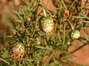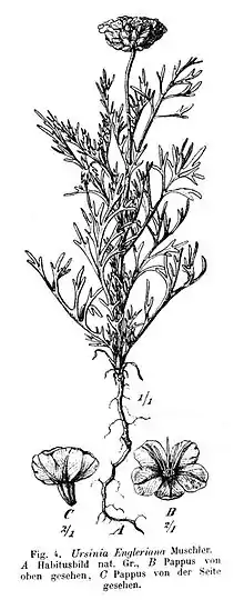 Ursinia nana DC. is an annual herb belonging to the daisy family of Asteraceae. It native to Africa, where it has a disjunct distribution in northeastern Africa (Eritrea and Ethiopia) and southern Africa (South Africa, Lesotho, Namibia, and Zimbabwe).[1] It is a pioneer plant of disturbed ground and usually grows to a height of only 30 cm. It flowers throughout the rainy season and, in mild weather with late rains, well into the autumn months. The leaves are deeply laciniate and bunched. In his 1912 contribution to Botanische Jahrbücher für Systematik, Pflanzengeschichte und Pflanzengeographie, the enigmatic German botanist Reinhold Conrad Muschler describes Ursinia engleriana, found near Okahandja in South West Africa, as a new species of African composite. Later this was considered to be the same as Ursinia nana described by de Candolle. Muschler praised the species as being extremely ornamental.[2]