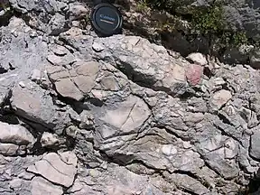 The Croatian mountain chain Velebit is probably the richest area in karstic uvalas of the Dinarides, Poljak (1951) cited by Ćalić (2009) p. 70. The breccia in this chain – there known as Jelar breccia – show very extensive outcropping.[24] These highly permeable carbonate breccias are a prominent feature of "Middle Eocene to Middle Miocene" age faulting activities in the Velebit area, Vlahovic et al. (2012). The deep incision of Velebit's most prominent uvala Lomska Duliba can be explained by the presence of the Jelar breccias, Ćalić (2009), p. 72.[25]