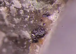 The mineral uytenbogaardtite, Ag3AuS2, is a soft, greyish white sulfide mineral, occurring in hydrothermal Au-Ag-quartz veins. It occurs as tiny crystals, visible only with a microscope. It has a metallic luster and a hardness on the Mohs scale of 2 (gypsum).