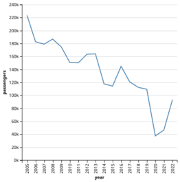 In 2001, Ryanair started flights, the first route led to London Stansted. In 2006, Ryanair left the airport, but returned again in 2007. The same year, Scandinavian Airlines ended their flights from Västerås.