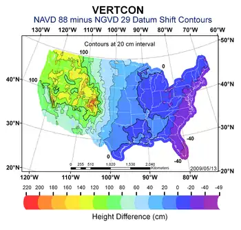 VERTCON is a computer program that computes the modeled difference in orthometric height between the North American Vertical Datum of 1988 (NAVD 88) and the National Geodetic Vertical Datum of 1929 (NGVD 29) for a location in the contiguous United States.[1] The parameters required are the latitude and longitude of the location.