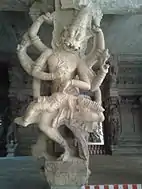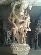 Vaishnava Nambi temple is located in Thirukkurungudi, a village in Tirunelveli district in the South Indian state of Tamil Nadu. It is located 45 km (28 mi) from Tirunelveli and 11 km (6.8 mi) from Nanguneri. The temple has a flat entrance tower and a five-tiered gopuram (gateway tower). The temple has five prakarams, closed precincts of a temple and all the shrines are enclosed in the first two enclosures.[3][4] The temple occupies around 18.5 acres (7.5 ha). There are a number of halls, that have sculpted pillars from the Nayak period.[2] There is a festival hall in the second precinct in the temple facing South that has sculpted pillars indicating various Hindu legends. The most notable of them being a legend of Mahabharata where Bhima attacks a lion legged person with his club.[5] The composite columns of Virabhadra holding sword and horn are found be additions of the Vijayanayagara kings during the early 1500s. Similar columns of Virabhadra are found in Adikesava Perumal Temple at Thiruvattaru, Meenakshi Temple at Madurai, Nellaiappar Temple at Tirunelveli, Kasi Viswanathar temple at Tenkasi, Krishnapuram Venkatachalapathy temple, Ramanathaswamy Temple at Rameswaram, Soundararajaperumal temple at Thadikombu, Srivilliputhur Andal temple, Srivaikuntanathan Permual temple at Srivaikuntam and Avudayarkovil.[6]