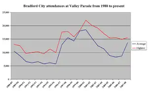 Official attendance figures for league games were not kept by The Football League until 1925. City's official highest average attendance at Valley Parade since then is 18,551 for the 1928–29 promotion season from Division Three (North),[81] although the club reported an average of 22,585 in 1920–21.[82] It was not until City were promoted to the Premier League in 1999 that the club again recorded average attendances of higher than 18,000. City recorded an average of 18,030 in 1999–2000, and 18,511 the following season.[83]