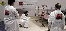 MER team members Alfonso Herrera, Vandana Verma, Bruce Banerdt, testing Spirit rover.