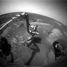 Mars rover Opportunity drills into a rock to retrieve a sample using its robotic arm.