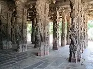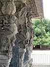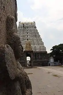 The main sanctum faces west and can be entered through a 130-feet-tall, 7-tiered rajagopuram (main gateway tower).[4] The image of the presiding deity is designed in such a way that on the 15th day after Chitra Purnima, the rays of the Sun fall on the idol.[26] The hill, called Hastagiri, is 360 m (1,180 ft) long by 240 metres (790 ft).[27] The eastern gopuram is taller than the western gopuram, which is contrasting to large temples where the rajagopuram is the tallest one.[4] One of the most famous architectural pieces in the temple is the huge stone chain sculpted in a single stone.[28] There is a 100 pillared hall[29] which has sculptures depicting Ramayana and Mahabharata. It is a masterpiece of Vijayanagara architecture.[21][28]