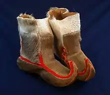 Sami boots (Northern Sami: Seahkohat), made from brown and white hide from a reindeer leg, exhibited at the Varanger Sami Museum.
