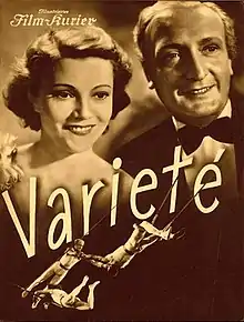 Variety (German title: Varieté ) is a 1935 French-German drama film directed by Nicolas Farkas and starring Annabella, Hans Albers and Attila Hörbiger.[1] It is based on the 1912 novel The Oath of Stephan Huller by Felix Hollaender. It features a love triangle between three performers of a high wire act.