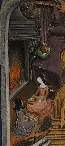 The first section of the manuscript (ff. 1-185v), La Passion de Nostre Seigneur (The Passion of Our Lord), which was originally translated from Latin into French for Isabelle of Bavaria in 1398, is almost identical to several other Passion de Jésus-Christ manuscripts such as Bibliothèque de l'Arsenal MSS. 2038 and 2386, and Bibliothèque Mazarine MS. 949.[2] Thirty-three of the thirty-four miniatures accompany this text. The presentation page (f. 9) shows Henry VII and his children, Margaret, Mary and the future Henry VIII, mourning the death of Elizabeth of York, his wife and their mother. The king is wearing robes of mourning; in the background his daughters, wearing black hoods, kneel in front of a fire; and behind them their brother Henry, dressed in a green smock, clasps his arms around his head and weeps on his mother's deathbed.[1][2][3]