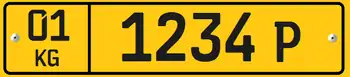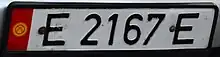 The license plates have the format ## - ### xxx, where the first two digits are province codes. The plate is black on white. Right under the province codes, there is the Kyrgyz flag and the code KG.