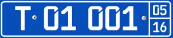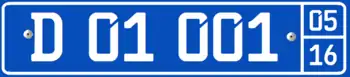 The three digit number is assigned in increasing order. Numbers 001 to 099 are assigned to diplomatic missions, and numbers 100 to 999 to private cars of the diplomats. On the right end, the date of the issuance of the plate is posted, with the month on the top, and the year on the bottom.