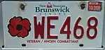 2021-present | Embossed red serial on reflective white plate with curved gold and sky blue bands at the top; screened provincial wordmark (red galley graphic with small blue waves and "New" to the left, "Nouveau" to the right and "Brunswick" and "CANADA" below, all in green) on bands, centred above serial with red poppy to the left of serial | "VETERAN / ANCIEN COMBATTANT" | WAB01 | WAA01 to WAX19 (As of November 30, 2023)[6] |