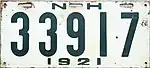 1921 | Dark green serial on white flat metal plate; "N H" and "1921" centered at top and bottom respectively | none | 12345 | 100 to approximately 42500 | |